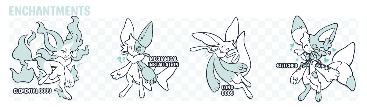 Artificial traits are traits that are not inherit to any layer, rather they are developed through magical means, or sometimes passed on from parent to child.Artificial Traits can be broken into two categories: Enchantments (which are often times used by the buyer to unlock beneficial or aesthetically pleasing traits) and Curses. (which are mostly bought to use on another Tatsukoi, as the traits are unsightly or even sometimes painful)Artificial Traits can be obtained by purchasing either an enchantment or curse scroll in the shop!---ENCHANTMENTS:Elemental Body: After being imbued with the energy of one or several elements, part (or all) of your Tatsukoi's body now features elemental traits! This enchantment's rules are very loose, as it can manifest in many ways. Some examples could be: a Tatsukoi with a body made of water, a Tatsukoi with flaming horns, a Tatsukoi who's fur begins to turn into wisps of air at the ends, and more! Feel free to experiment with this trait!Mechanical Installation: Some of your Tatsukoi's body is now comprised of mechanical parts! These parts must appear to be made of metal, glass, and/or plastic!Long Body: Part of your Tatsukoi's body is now extended longer than usual! Can effect the neck, torso, arms, and legs! (Can effect all of them at the same time, or just specific parts)Stitched: Your Tatsukoi's body is now made (partially or fully) out of fabric! Seams, buttons, ribbons, and stuffing can now be found in and on their body! You can also add clothing features like pockets, zippers, hoods, etc!